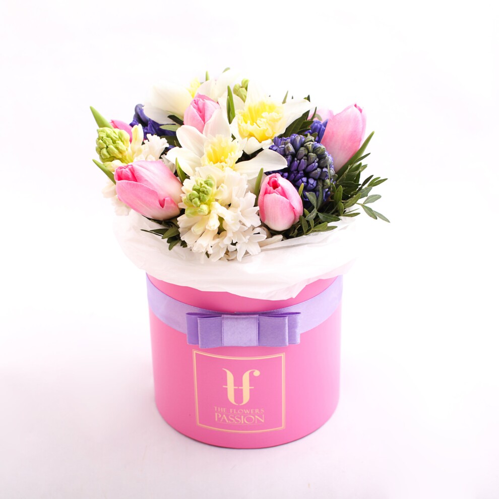 Наполнение: тюльпаны, гиацинт, нарцисс